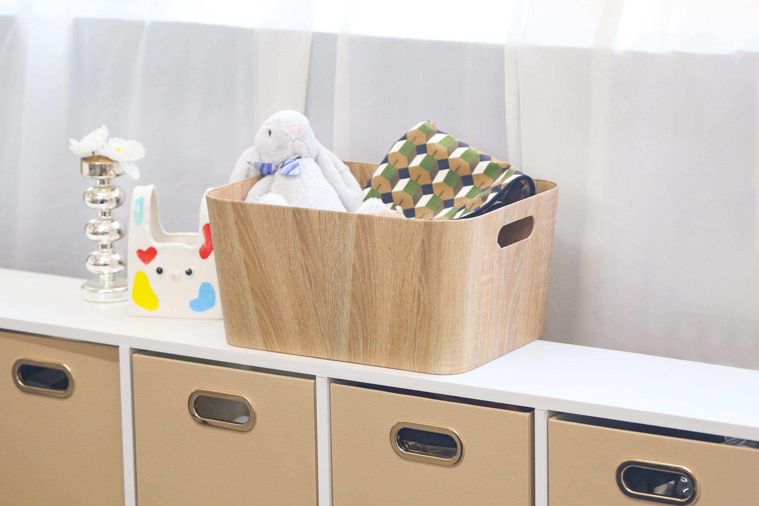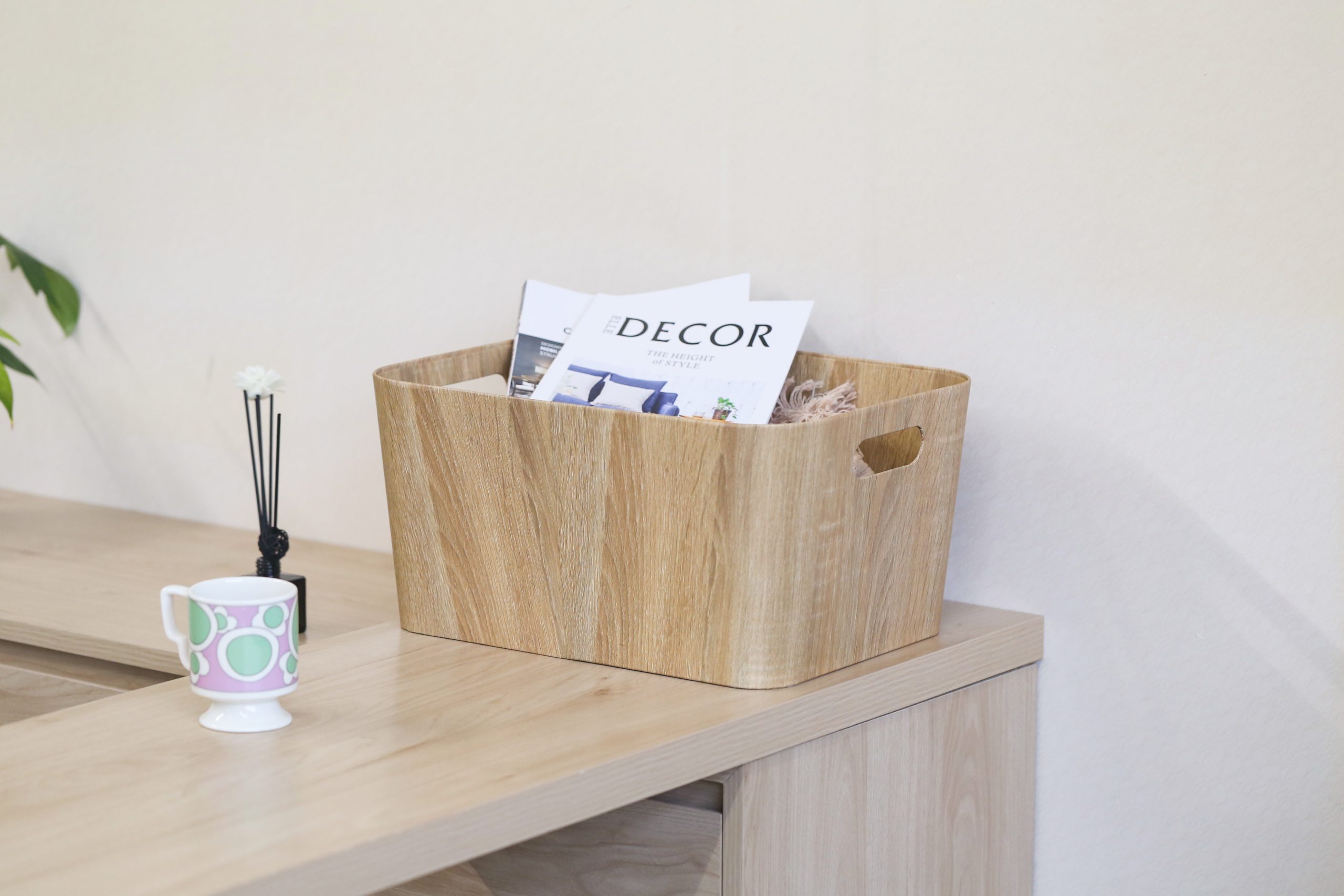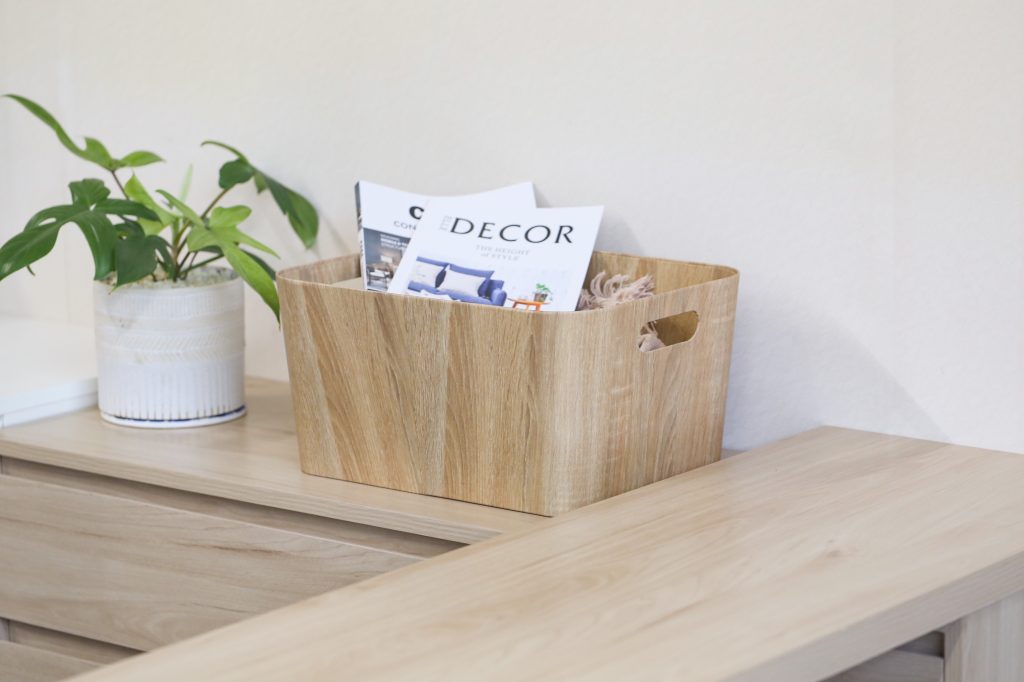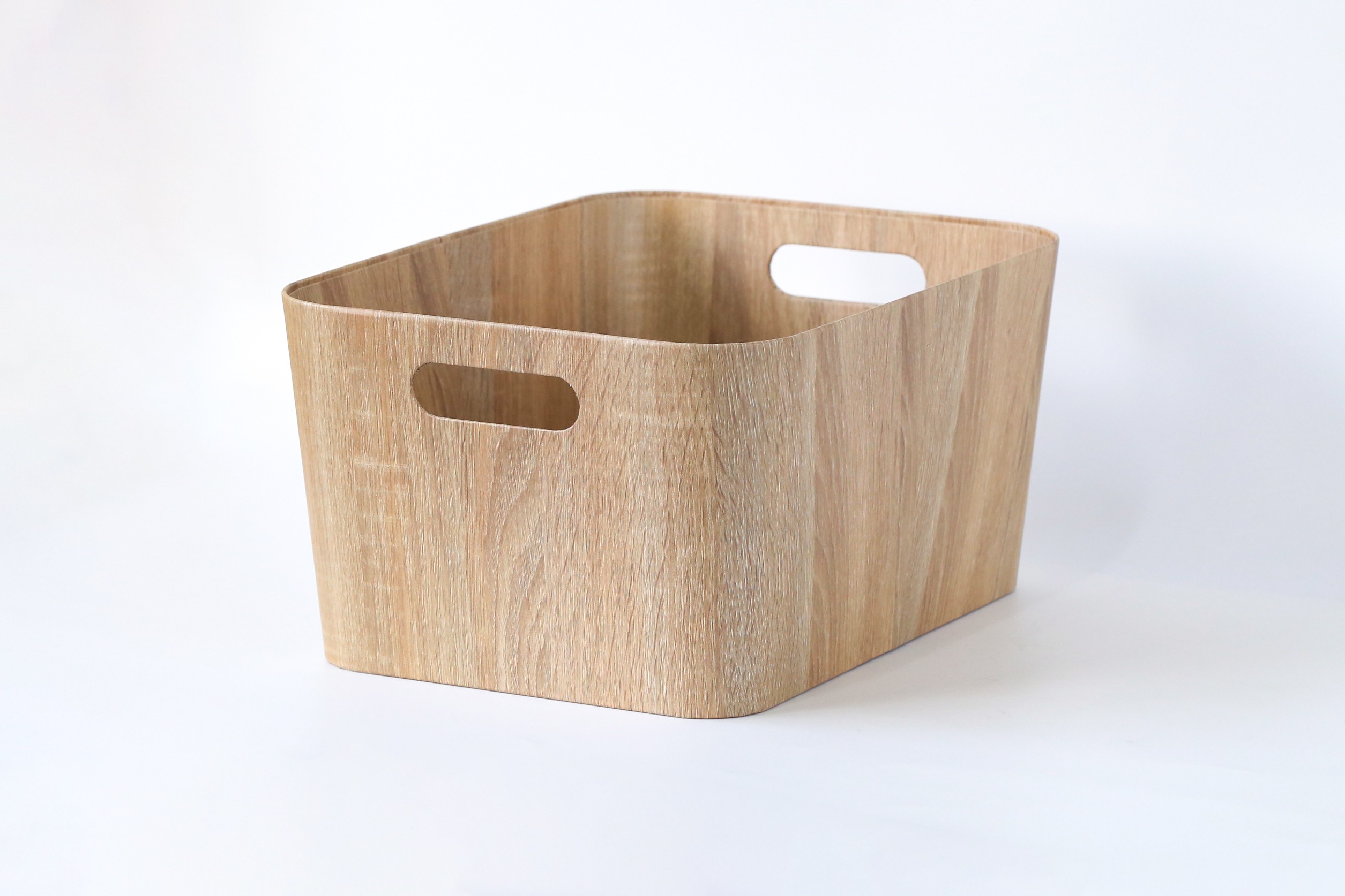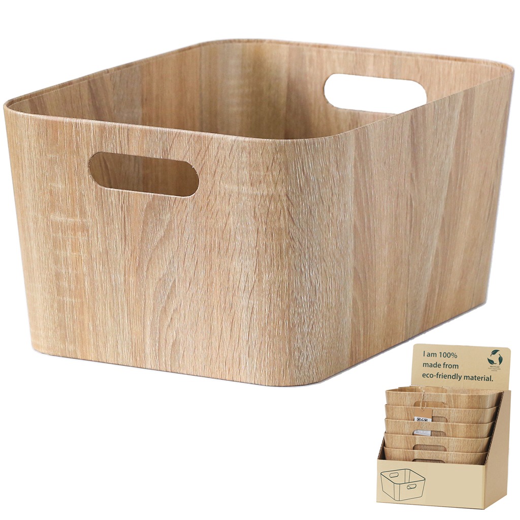 Cestas de almacenamiento con acabado símil madera, fabricadas con papel reciclado de alta calidad. Combinan un diseño cálido y natural con ligereza y resistencia, ofreciendo una solución práctica y sostenible para la organización del hogar. Ideales para ordenar estanterías, armarios o espacios comunes, aportan un toque decorativo y funcional a cualquier ambiente.