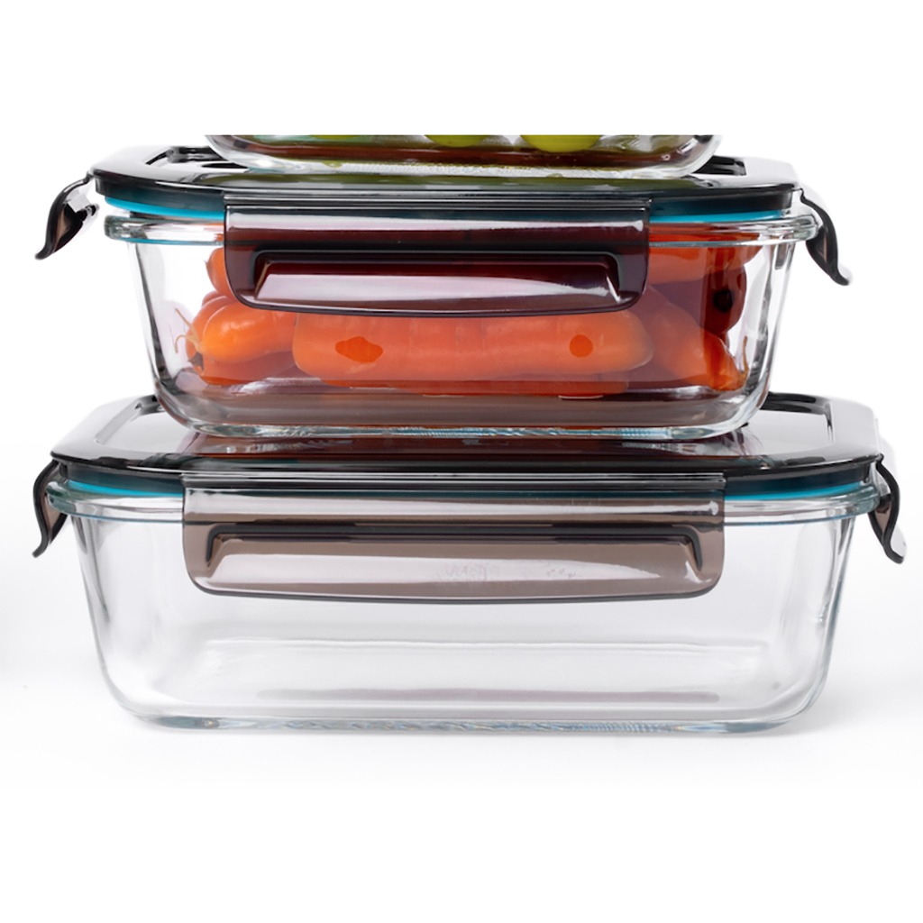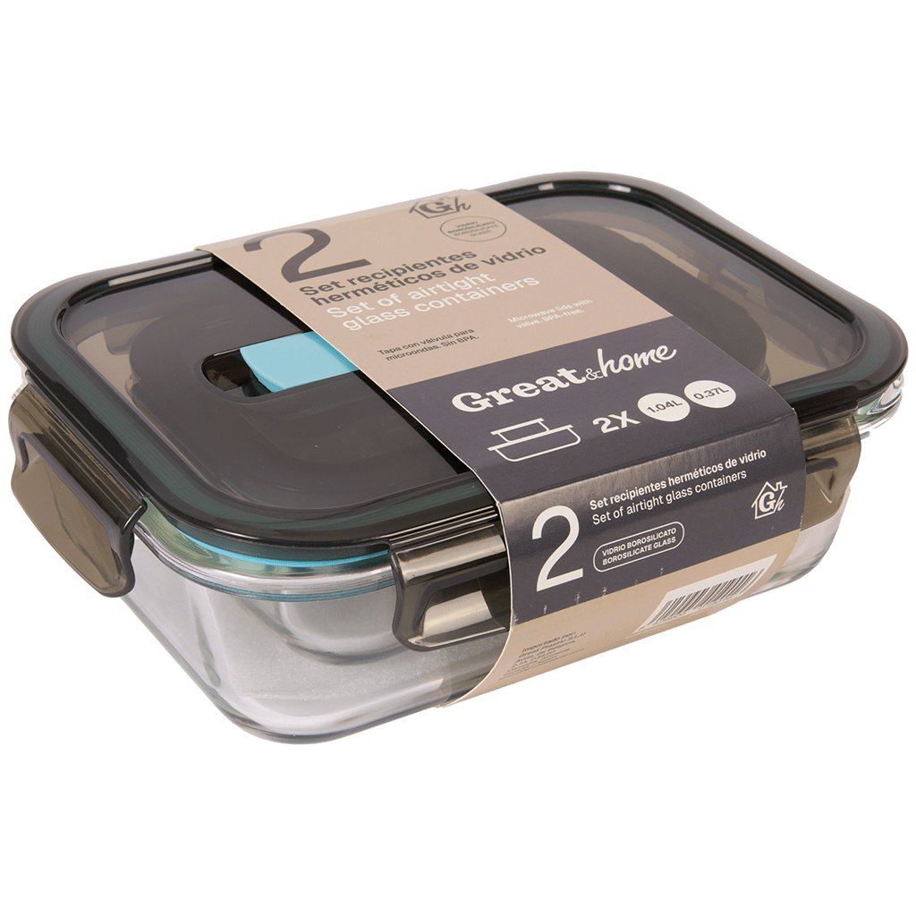 Pack de 2 recipientes de almacenamiento sin fugas y aptos para lavavajillas y horno. Fabricados en vidrio de borosilicato (resistente al calor 300º).  Tapa de polipropileno (sin BPA) con válvula para microondas. Cierre de silicona. Dos tamaños diferentes: 370 ml. y 1040 ml. 8 unidades en caja Master.