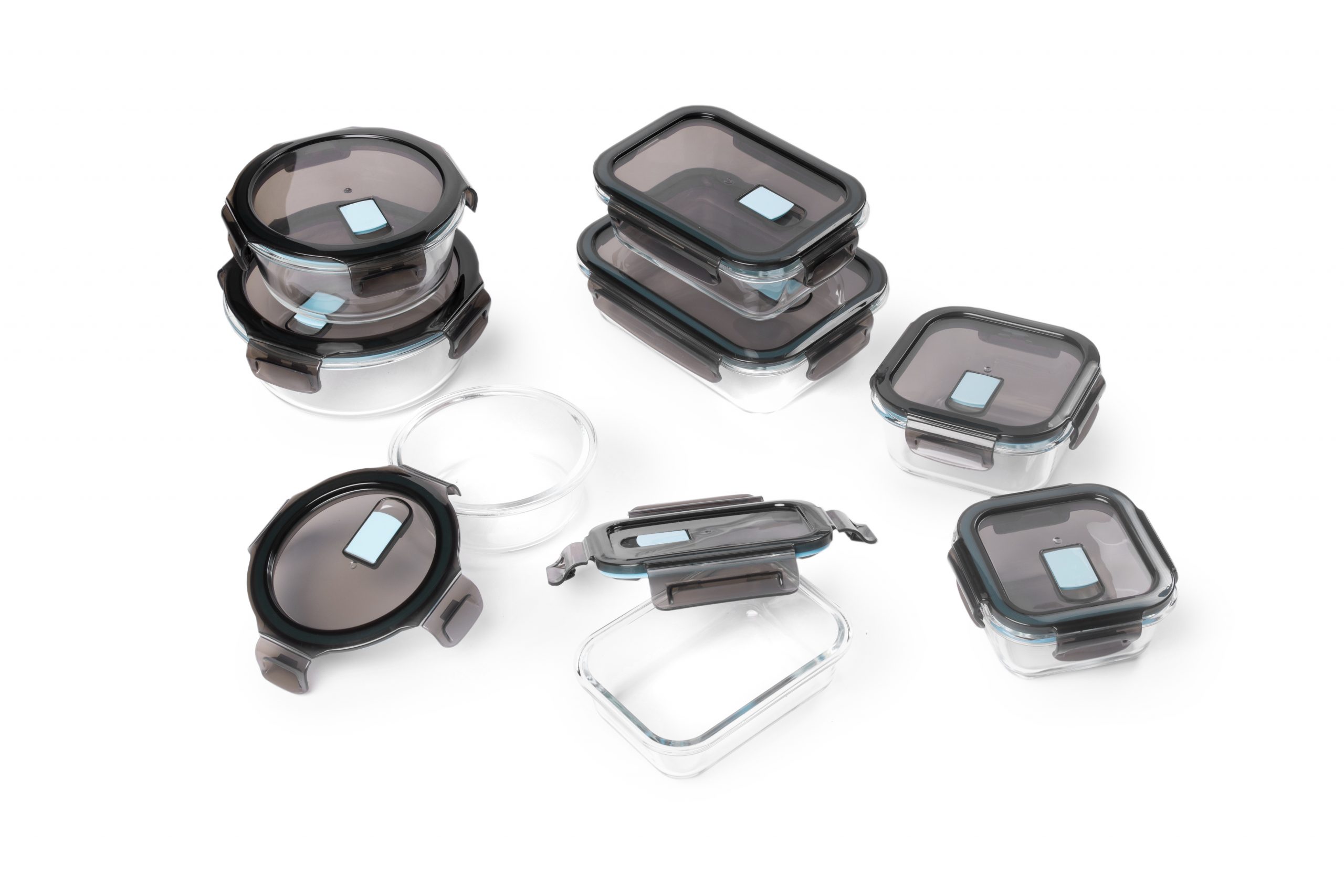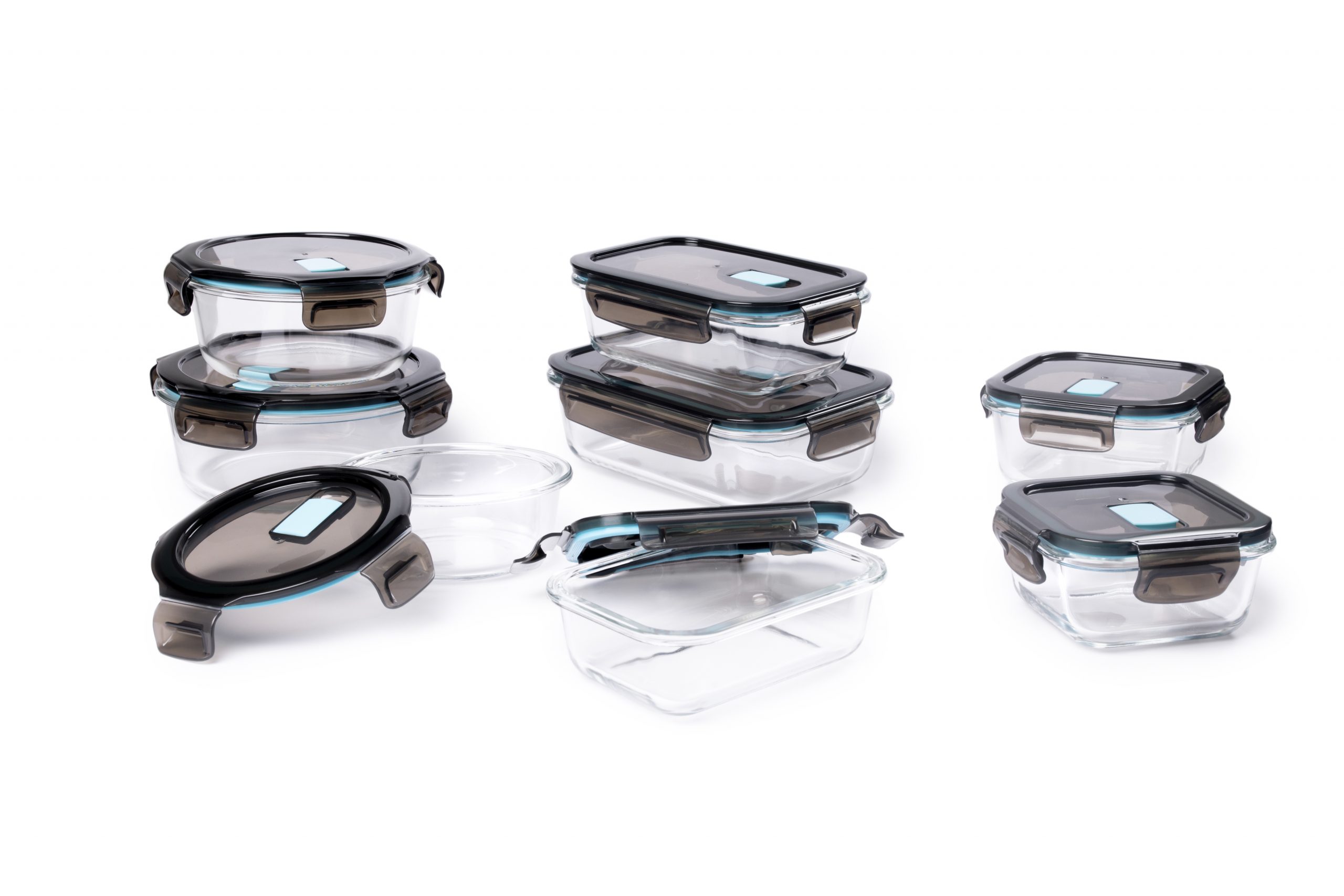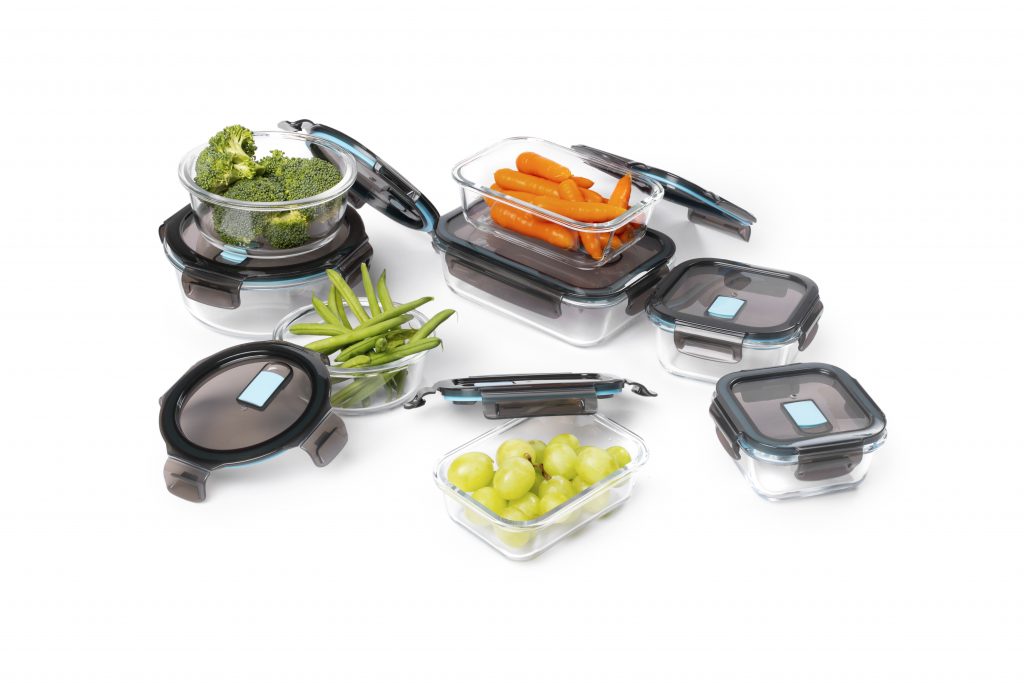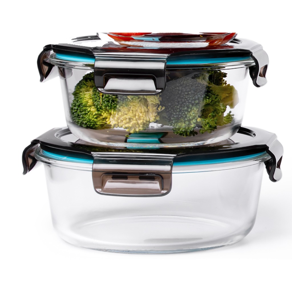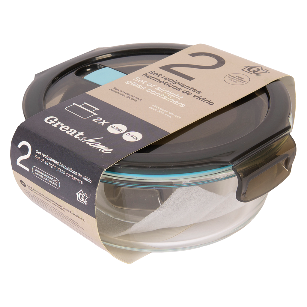 Pack de 2 recipientes de almacenamiento sin fugas y aptos para lavavajillas y horno. Fabricados en vidrio de borosilicato (resistente al calor 300º).  Tapa de polipropileno (sin BPA) con válvula para microondas. Cierre de silicona. Dos tamaños diferentes: 400 ml. y 950 ml. 8 unidades en caja Master.